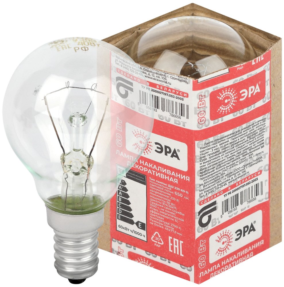 Станьте первым, кто оставит отзыв о товаре Лампа накаливания ЭРА E14 60W 2700K прозрачная ДШ 60-230-Е14 (гофра).