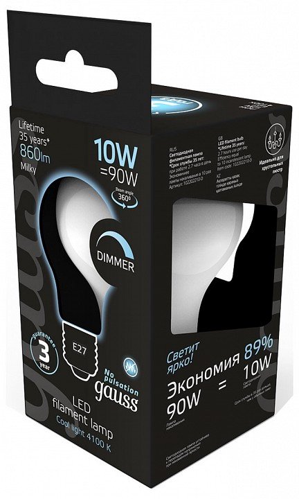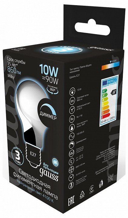 Станьте первым, кто оставит отзыв о товаре Лампа светодиодная Gauss диммируемая филаментная E27 10W 4100К матовая 102202210-D.