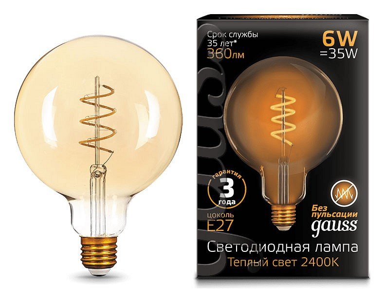 Главная Лампочки Лампа светодиодная филаментная Gauss E27 6W 2400K золотая 158802008
