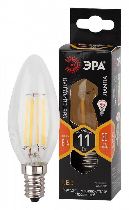 Главная Лампочки Лампа светодиодная филаментная ЭРА E14 11W 2700K прозрачная F-LED B35-11w-827-E14 Б0046985