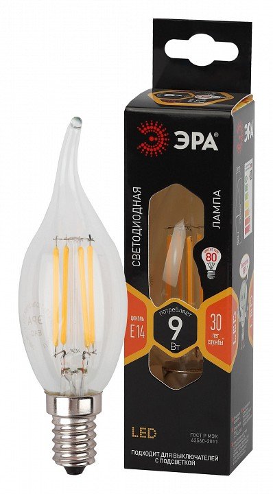 Лампа светодиодная филаментная ЭРА E14 9W 2700K прозрачная F-LED BXS-9W-827-E14 Б0047003