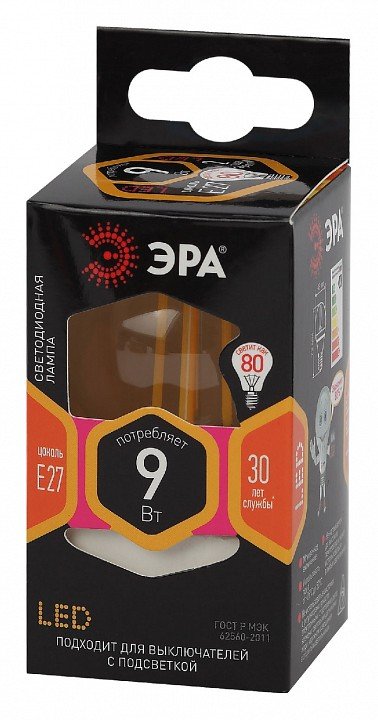 Лампа светодиодная филаментная ЭРА E14 9W 2700K прозрачная F-LED P45-9w-827-E14 Б0047020