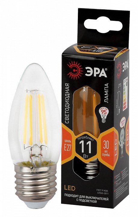 Лампа светодиодная филаментная ЭРА E27 11W 2700K прозрачная F-LED B35-11w-827-E27 Б0046986