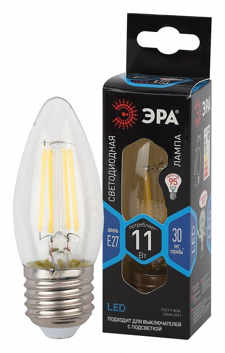 Главная Лампочки Лампа светодиодная филаментная ЭРА E27 11W 4000K прозрачная F-LED B35-11w-840-E27 Б0046988