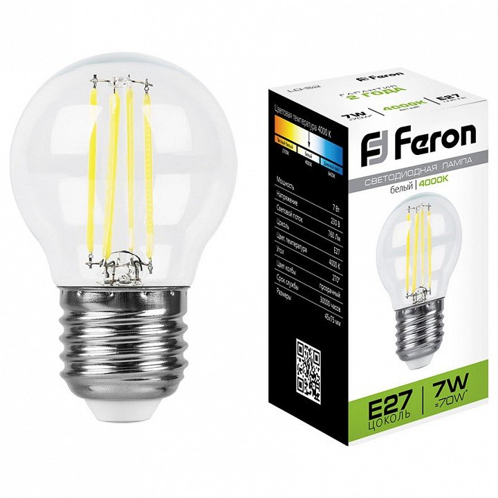 Главная Лампочки Лампа светодиодная филаментная Feron E27 7W 4000K Шар Прозрачная LB-52 25877