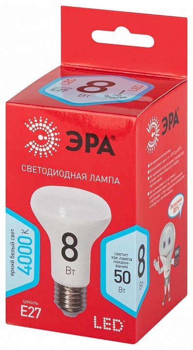 Главная Лампочки Лампа светодиодная ЭРА E27 8W 4000K матовая LED R63-8W-840-E27 R Б0052379