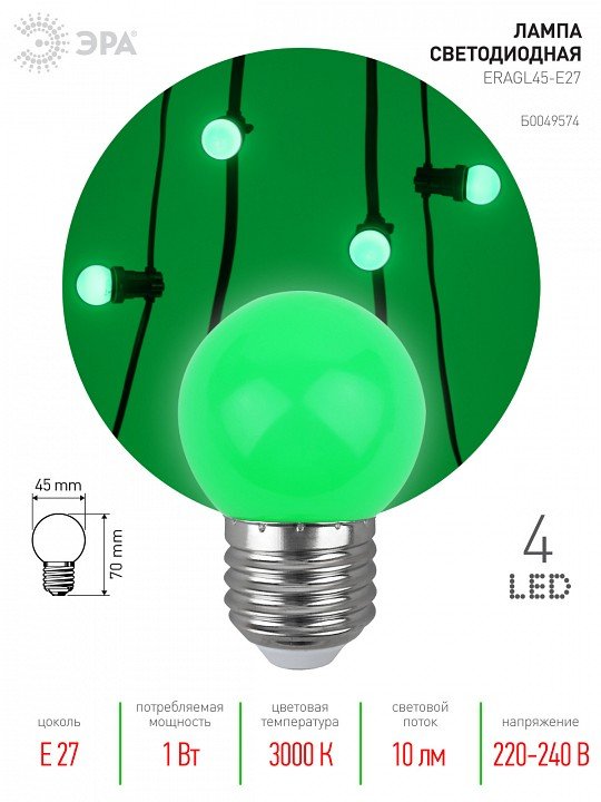 Лампа светодиодная ЭРА E27 1W 3000K зеленая ERAGL45-E27 Б0049574