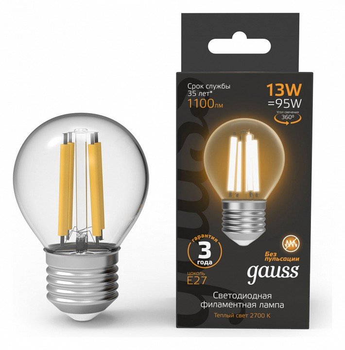 Главная Лампочки Лампа светодиодная филаментная Gauss E27 13W 2700K прозрачная 105802113