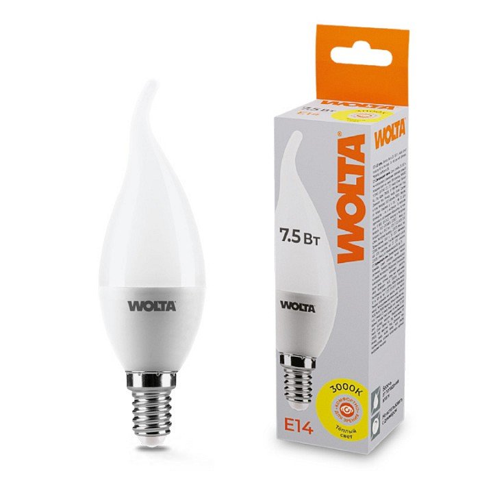 Главная Лампочки Лампа светодиодная Wolta E14 7.5Вт 3000K 25YCD7.5E14