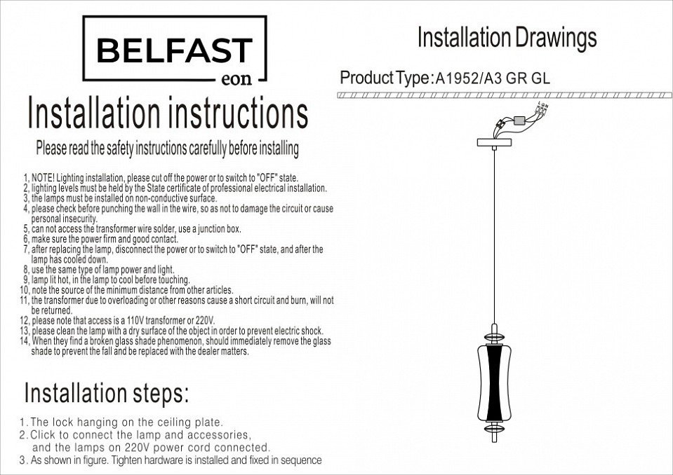 Станьте первым, кто оставит отзыв о товаре Подвесной светильник Belfast Herbison A1952-A3 GR GL.