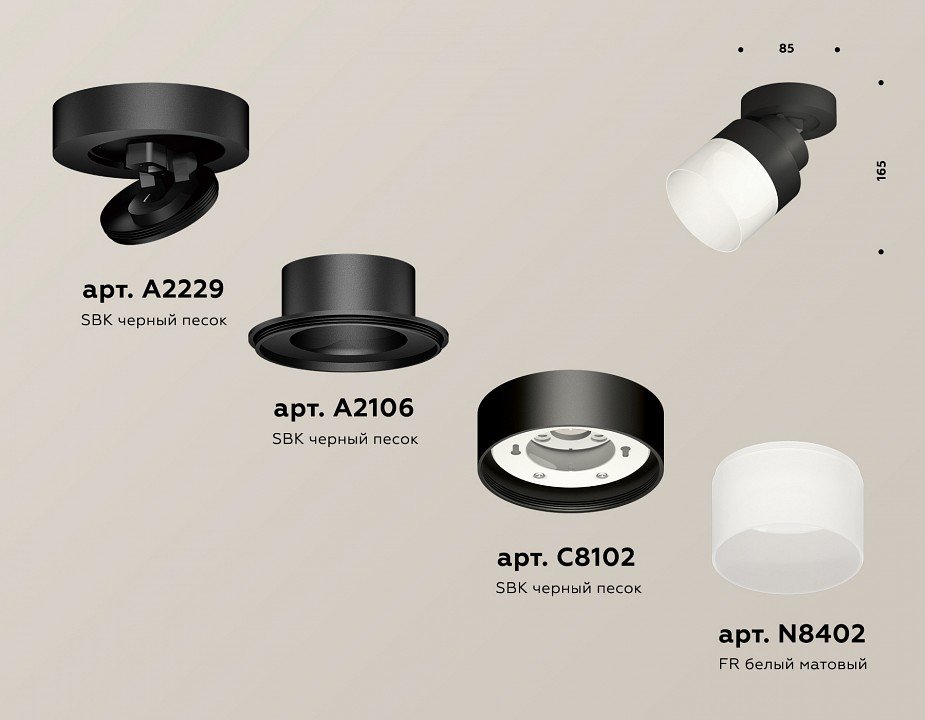 Компоненты, входящие в комплект: крепеж накладной поворотный d60. . коннектор d60-d85. корпус накладной d85. насадка передняя d85