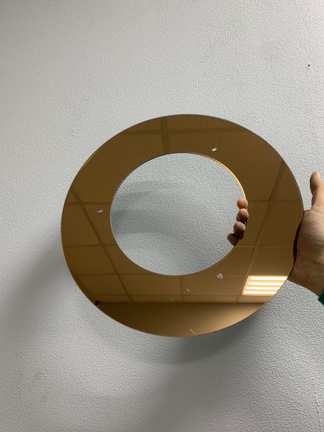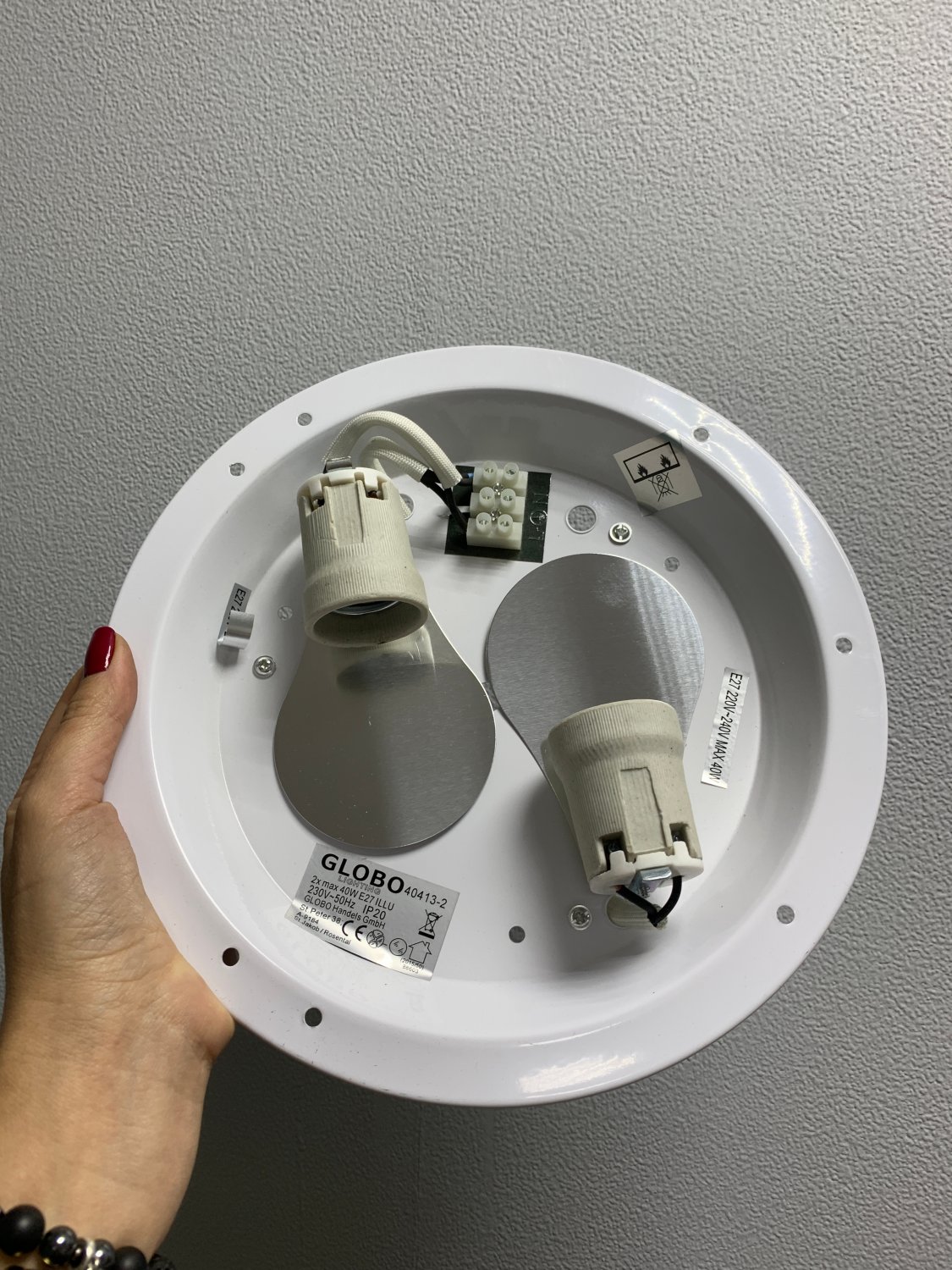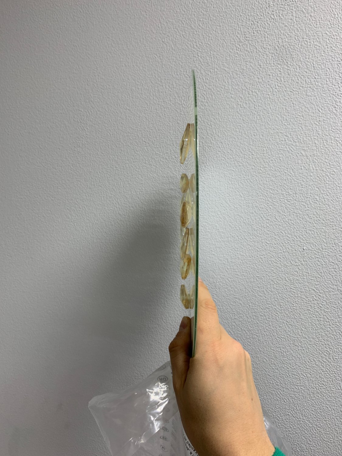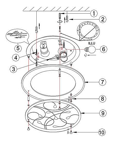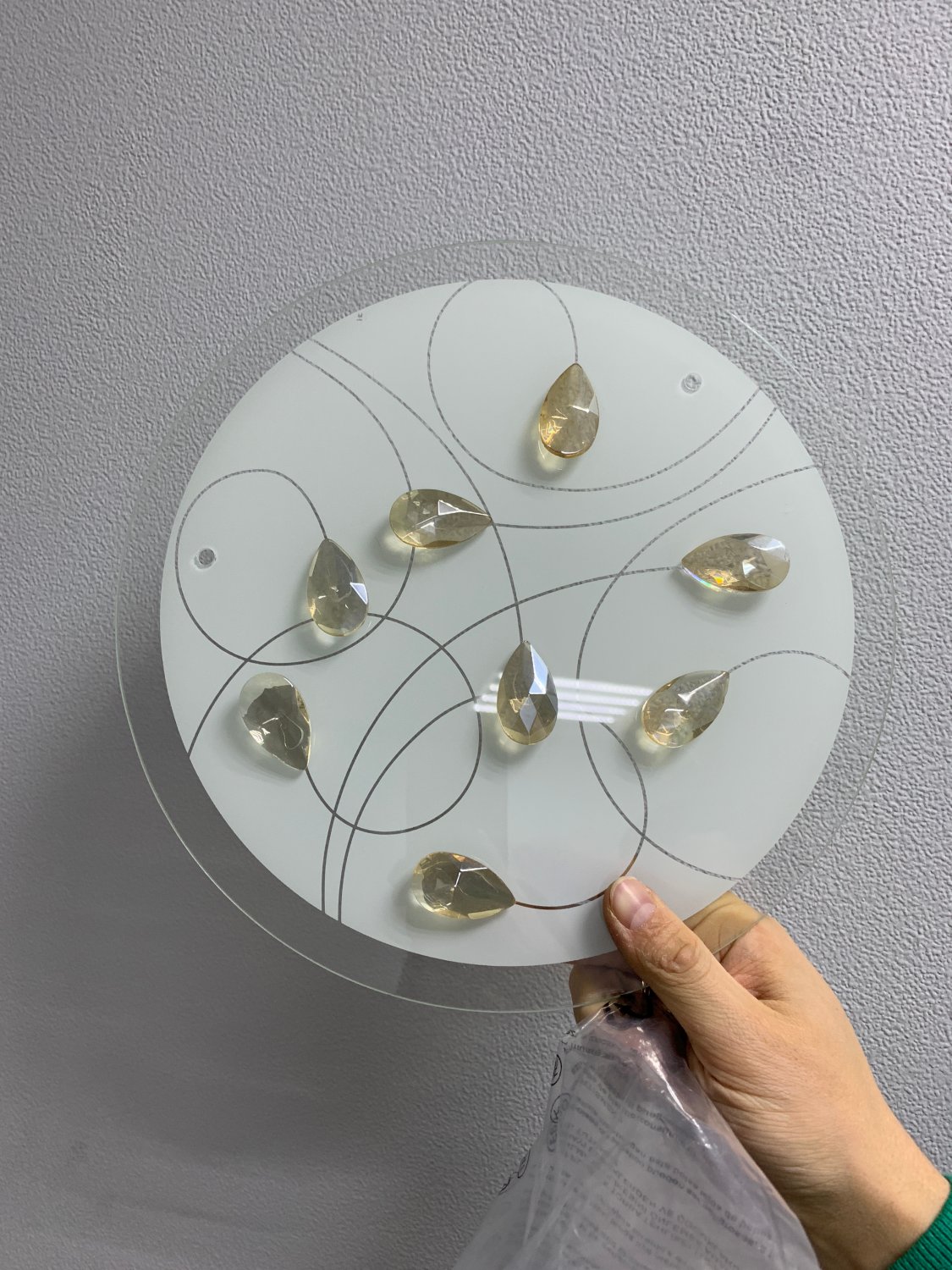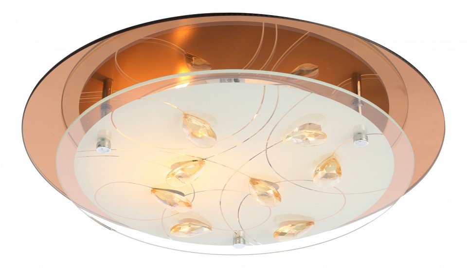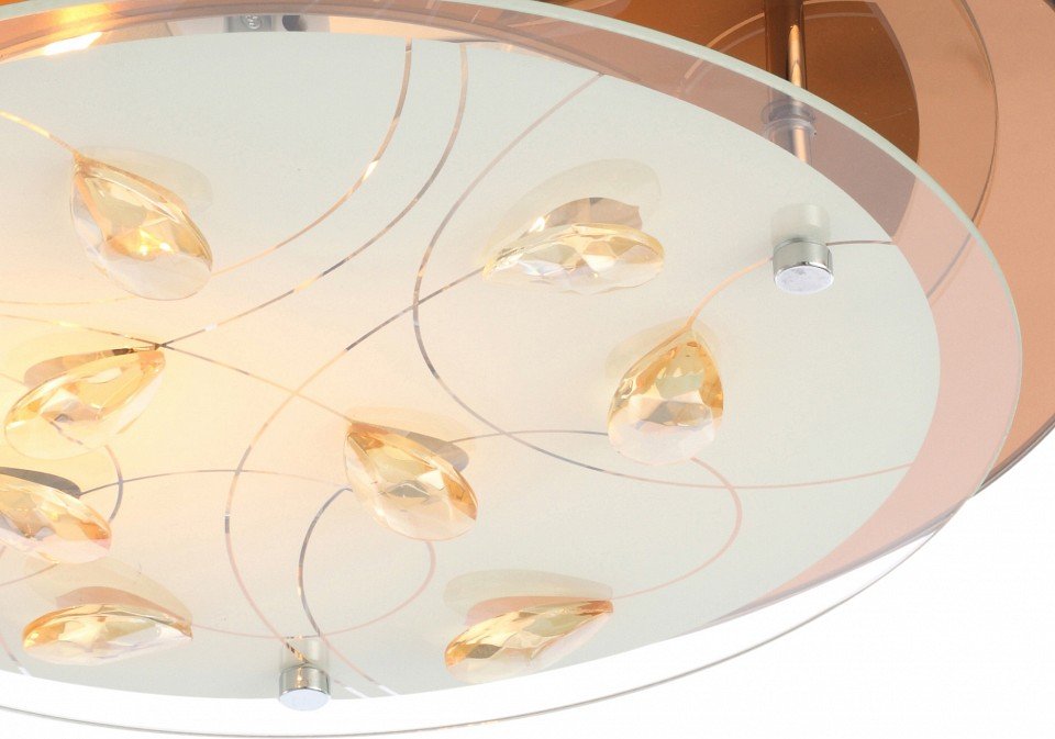 К сожалению, этот тот случай, когда светильник выглядит в живую на порядок лучше, чем на картинке и всю его красоту не передать фотографиями. Потолочный светильник достаточно большого диаметра - 35 см, состоит из основания, куда вкручиваются лампочки (оно не будет видно) и далее идет металлическая пластина бронзового цвета, глянцевая, которая будет очень хорошо и мягко отражать свет приятным оттенком и стекло, на которые наклеены стеклянные декоративные камушки. Бронзового цвета основа и объемность стекла - я вляются изюминкой данного светильника.