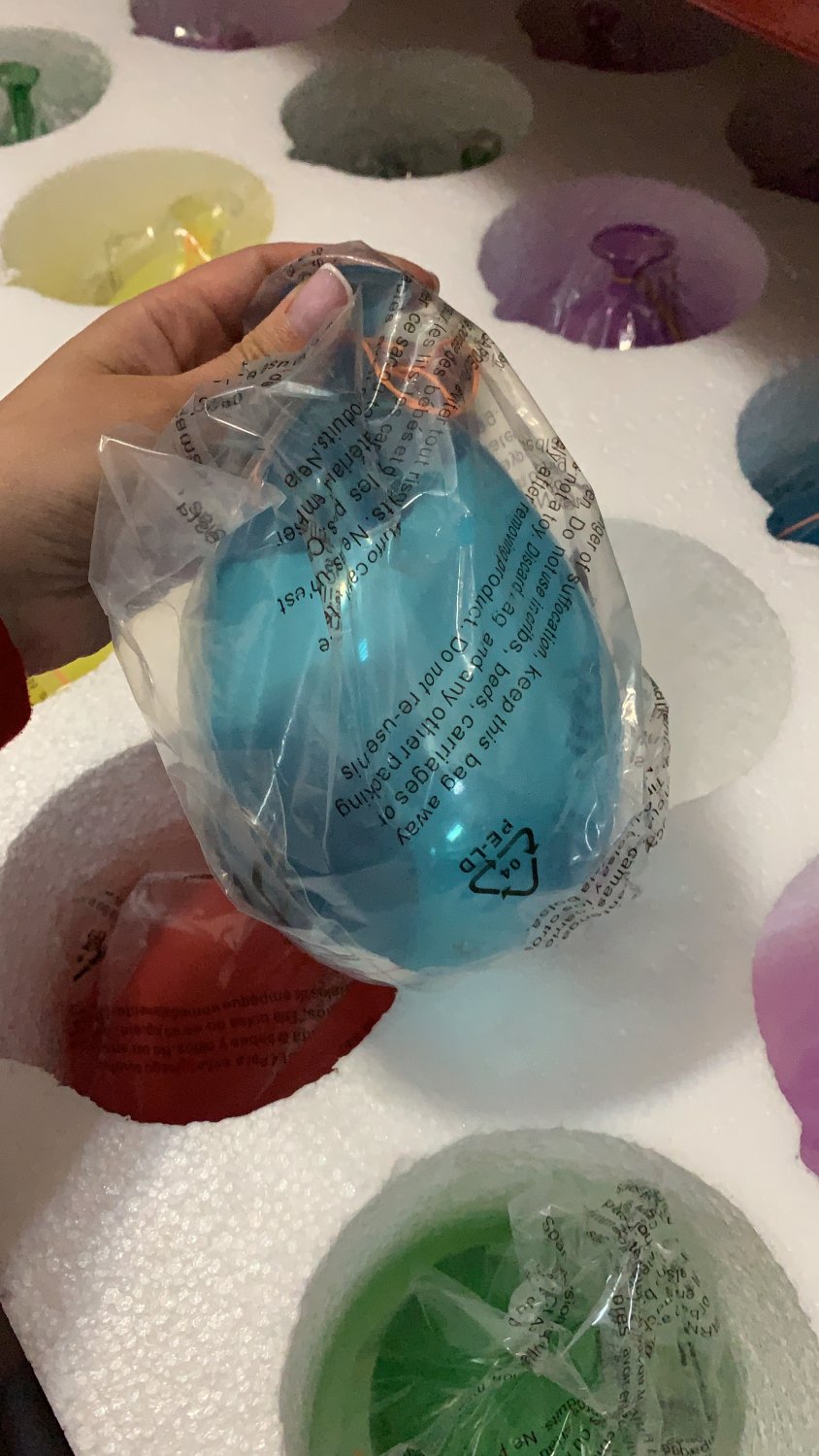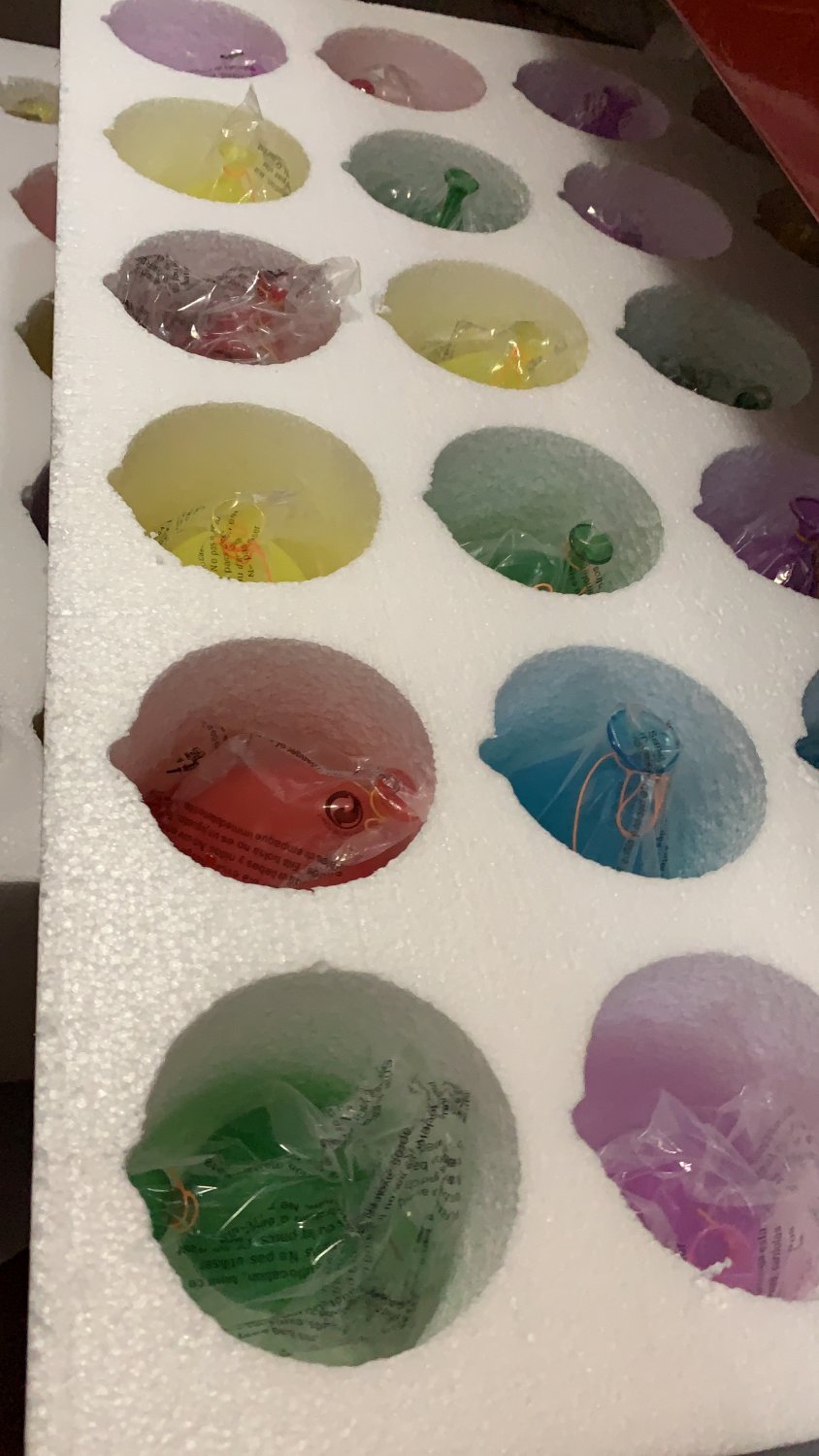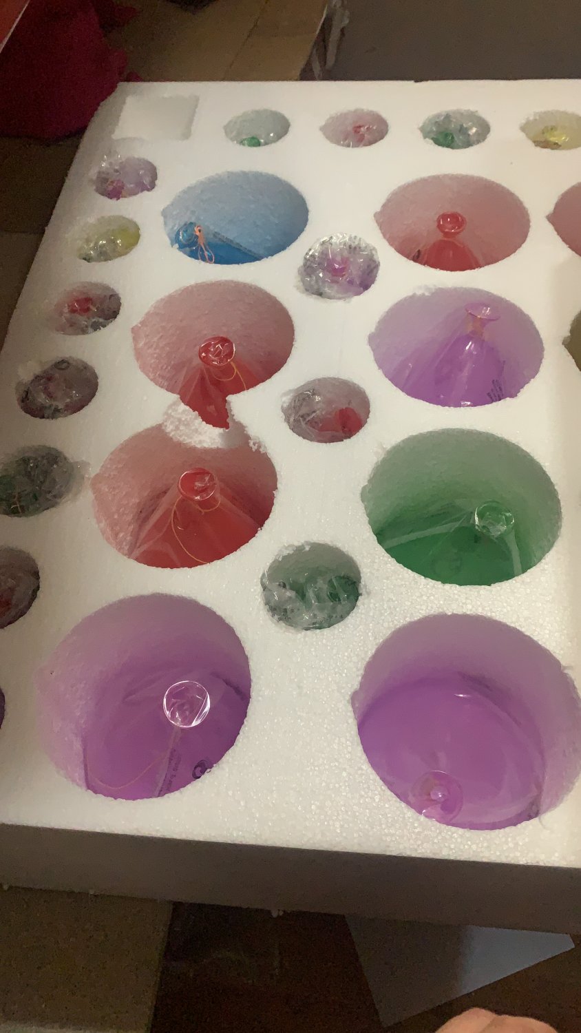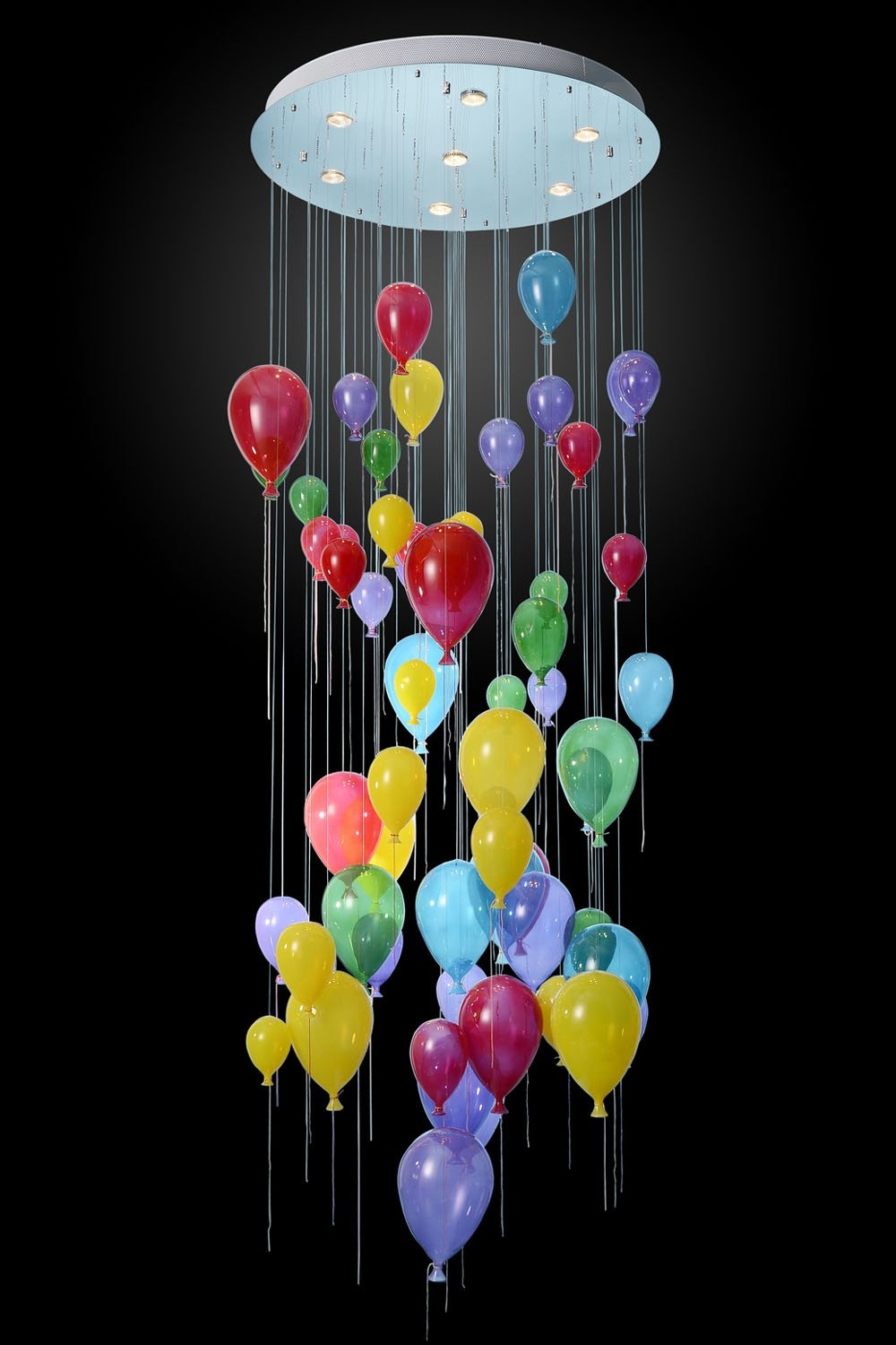 Люстра имеет высоту 2 метра, диаметр 80 см. Все шары стеклянные, крепятся на металличсекие тросы. На люстре 61 крепление под шары, в упаковке 63 шара (2 запасных). Но! если разобьется шарик какой-то, то светильник ничего не потеряет во внешнем виде, потому что шары висят хаотично.