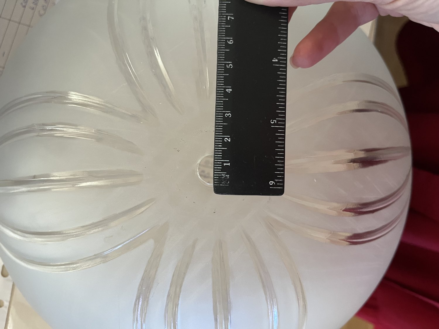 Диаметр плафона 30 см, высота 9,5 см. Диаметр нижнего отверстия - 13 мм