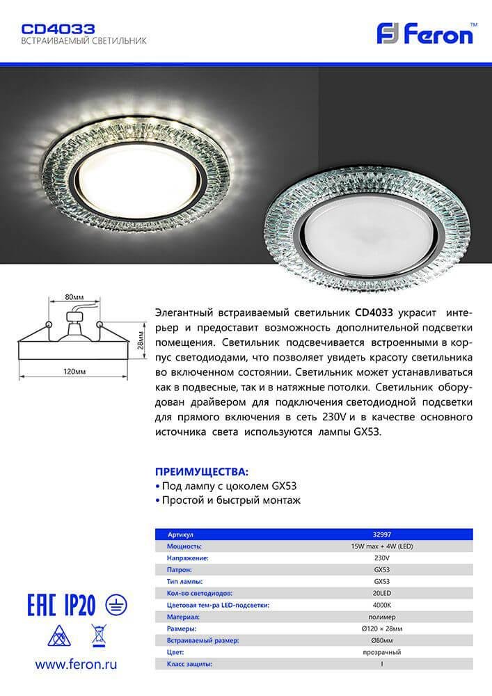 Главная Точечные светильники Встраиваемый светильник Feron CD4033 32997