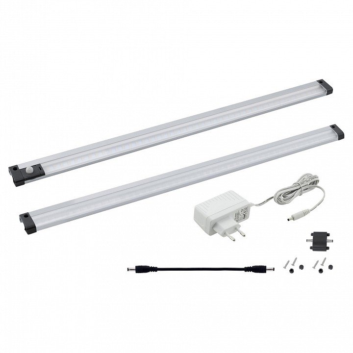 Компоненты, входящие в комплект: 2 светильника. блок питания 12 В. крепления. соединители