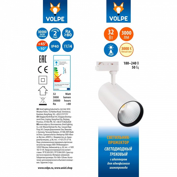 Главная Трековые светильники Трековый светодиодный светильник (UL-00005942) Volpe ULB-Q276 32W/3000К White