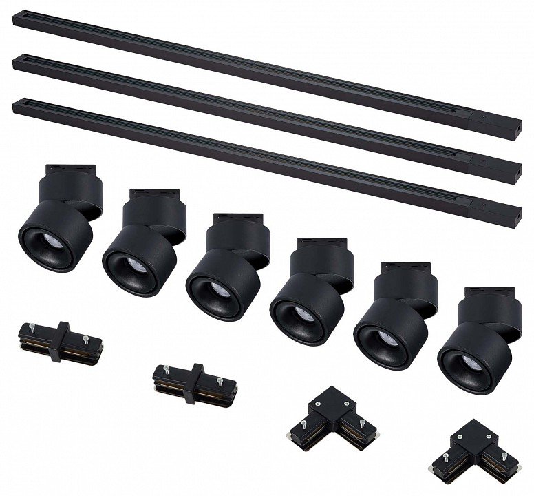 Компоненты, входящие в комплект: 3 шинопровода. 6 светильников. коннекторы