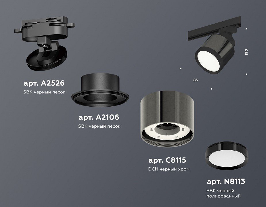 Компоненты, входящие в комплект: крепеж трековый d60. коннектор d60-d85. корпус накладной d85. насадка передняя d85