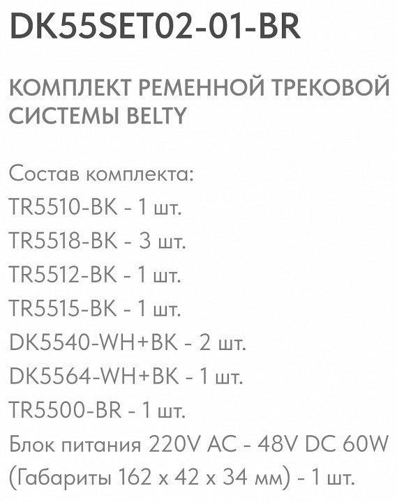 Компоненты, входящие в комплект: основание TR5510-BK - 1 шт.. крепеж крепеж TR5518-BK - 3 шт.. основание TR5512-BK- 1 шт.. основание TR5515-BK - 1 шт.. светильник DK5540-WH+BK - 2 шт.. светильник DK5564-WH+BK - 1 шт.. шинопровод TR5500-BR - 1 шт.. блок питания 220V AC - 48V DC 60W