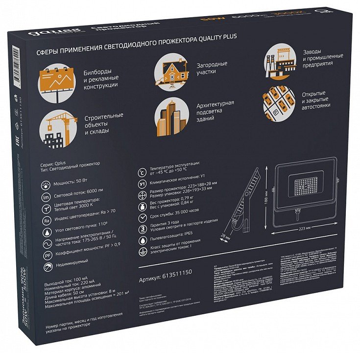 Станьте первым, кто оставит отзыв о товаре Прожектор светодиодный Gauss Qplus 50W 3000К 613511150.