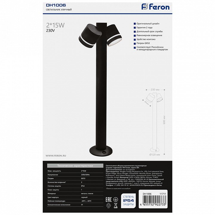 Главная Уличные светильники Уличный светильник Feron Рио DH1006 11711