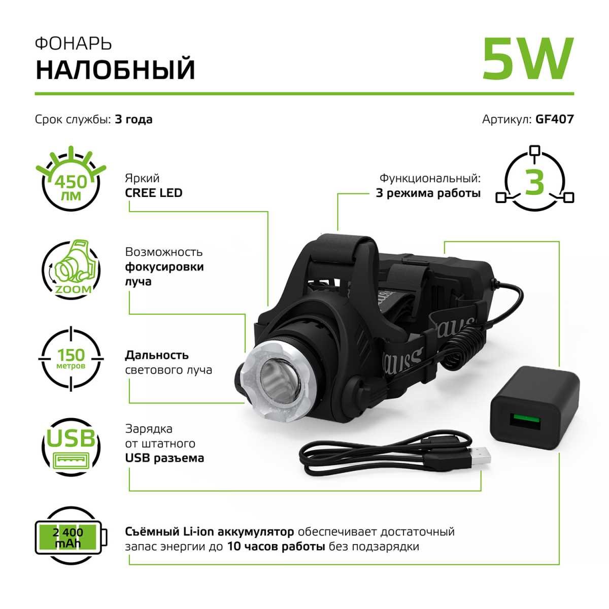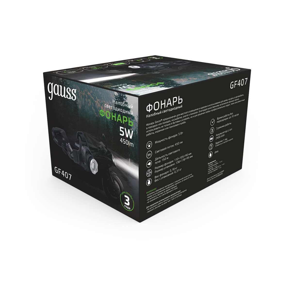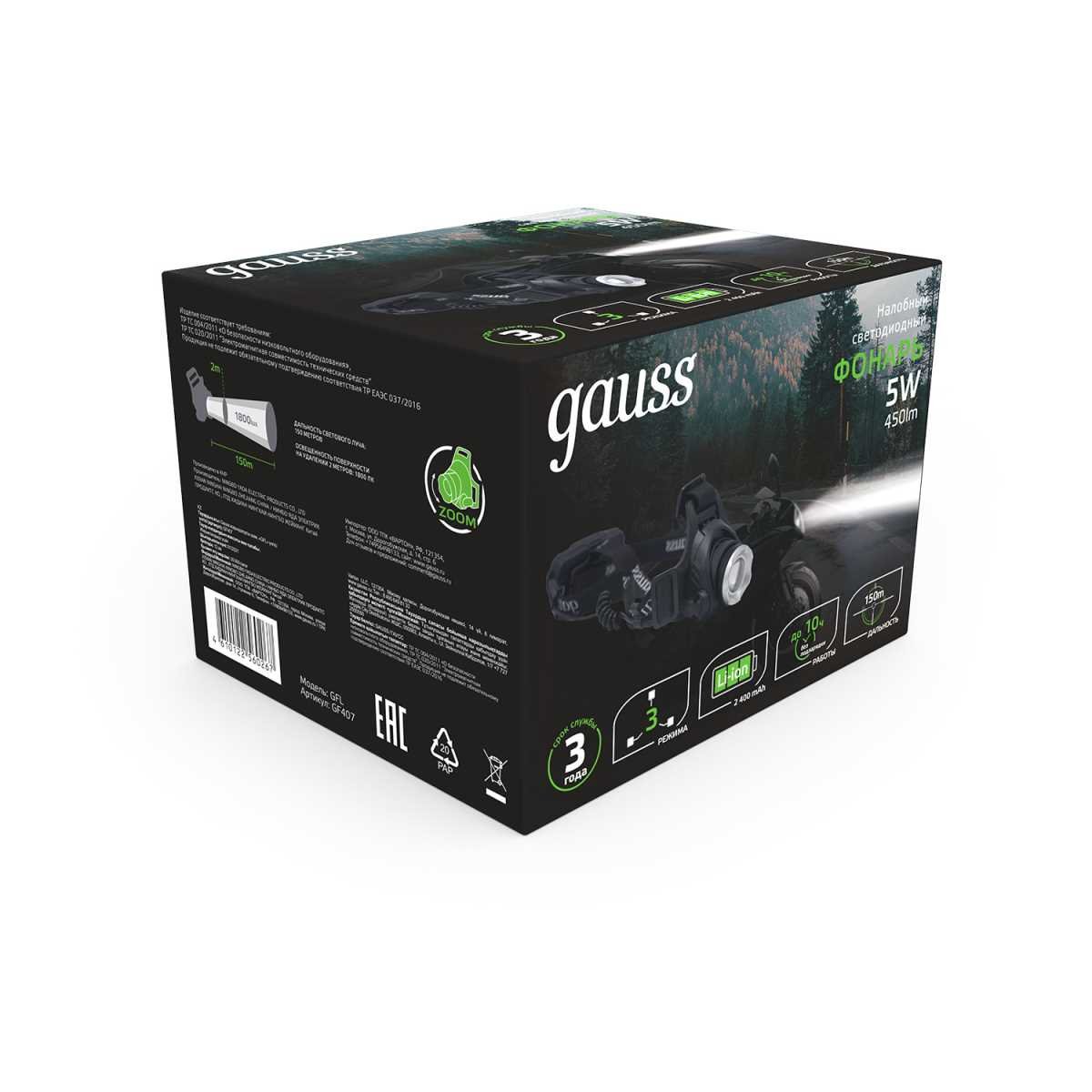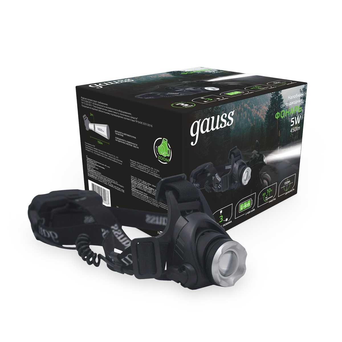Налобный светодиодный фонарь Gauss аккумуляторный 110х105 450 лм GF407
