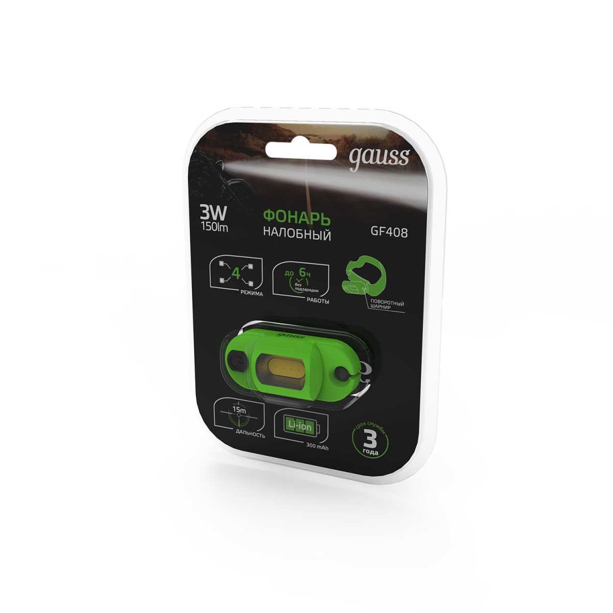 Налобный светодиодный фонарь Gauss аккумуляторный 30х60 150 лм GF408