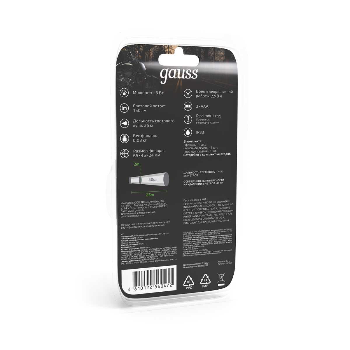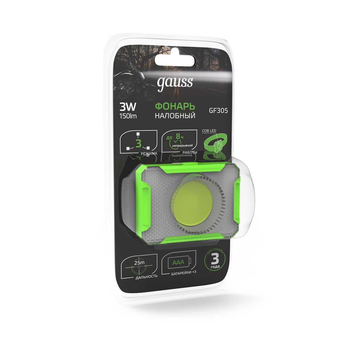 Налобный светодиодный фонарь Gauss от батареек 65х45 150 лм GF305
