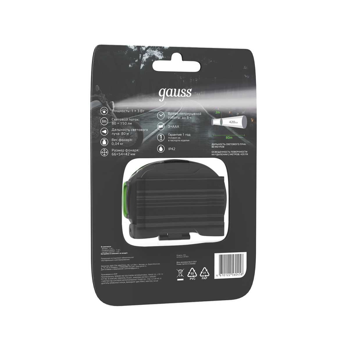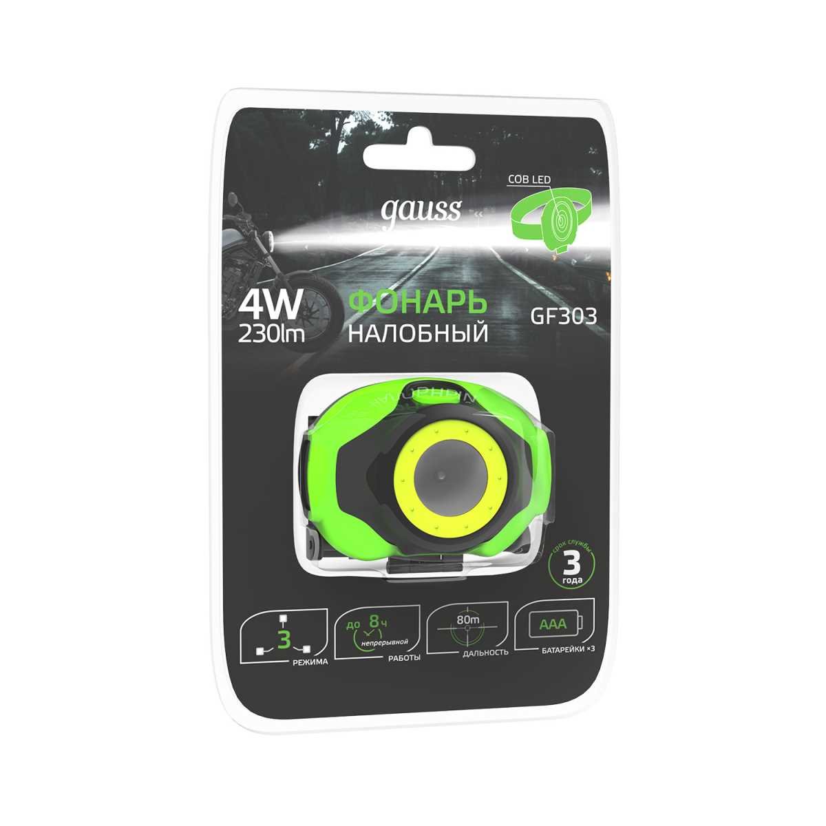 Налобный светодиодный фонарь Gauss от батареек 65х54 230 лм GF303